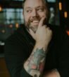 A modern bathroom featuring wooden herringbone-patterned flooring and walls. A sleek glass shower enclosure with black fixtures sits next to a wall-mounted toilet. Minimalistic white cabinets offer storage. The room is well-lit with recessed ceiling lights.